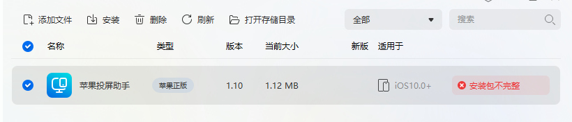 - 通过爱思助手进行安装苹果投屏助手安装包时显示安装包不完整。