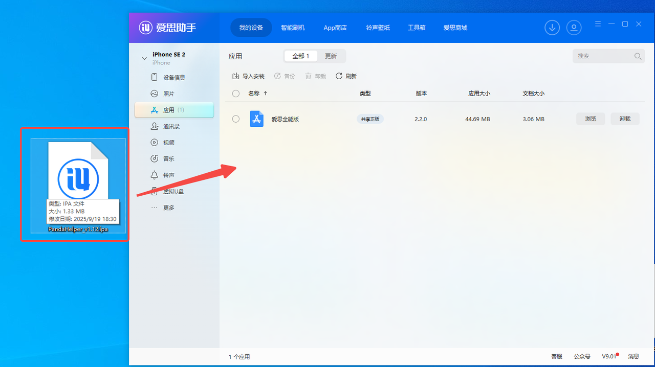 - 将电脑桌面上的PandaHelper.ipa文件拖入应用中,会自动进行安装