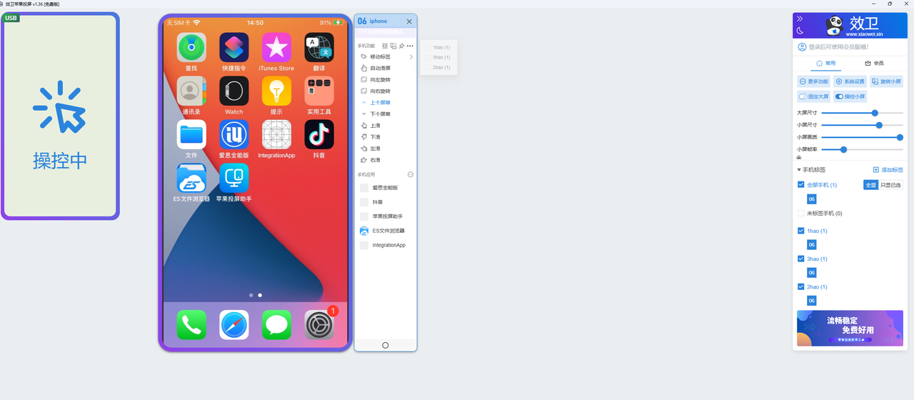 - 连接后手机画面就可以自动投屏到软件中并可以用鼠标操作手机界面。